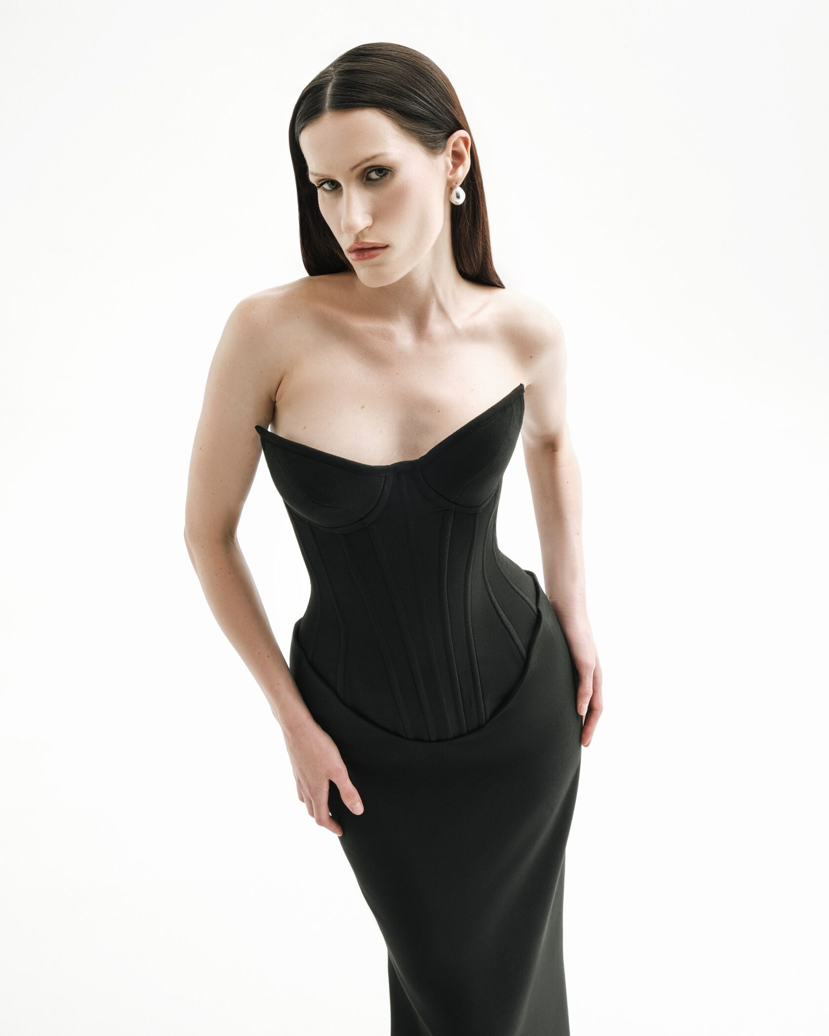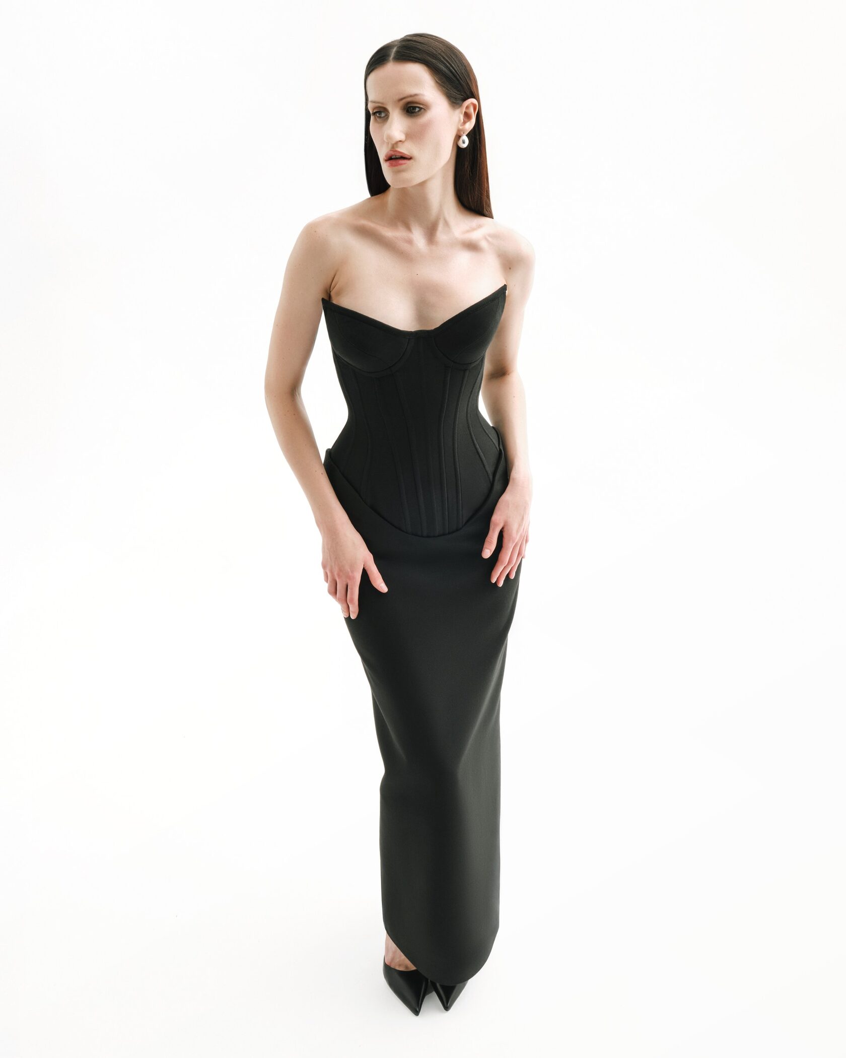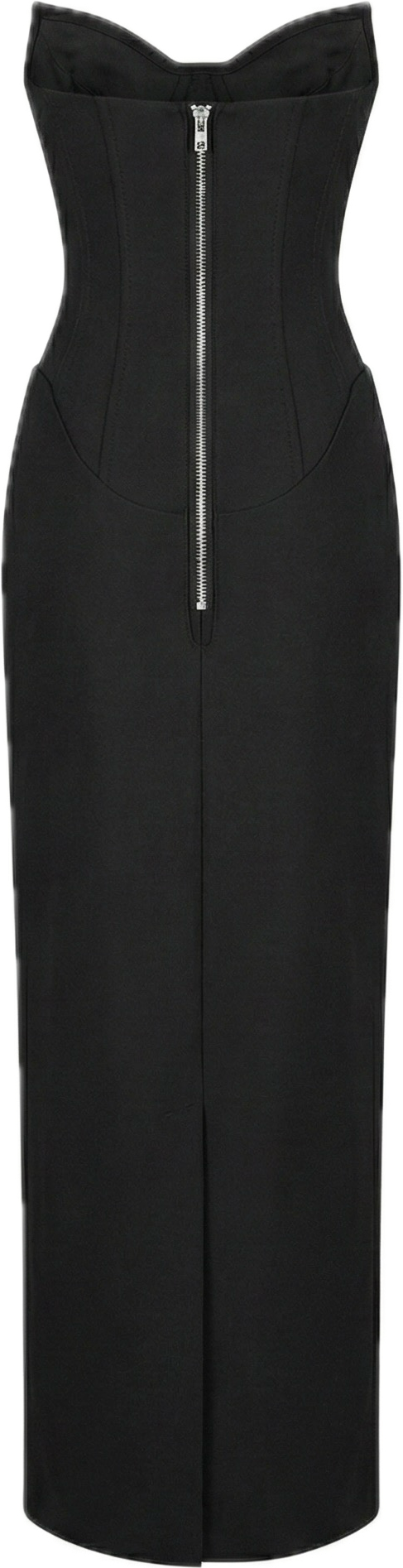 Description: Maxi dress with a fitted silhouette. The bodice features a sculptural corset design with cups that shapes the figure and accentuates the décolletage. • Features: waist seam, decorative corset stitching, back slit for ease of movement. Statement metal zipper closure at the center back. Composition: • Shell: 60% Polyester, 35% Viscose, 5% Cotton • Lining: 100% Cotton Care: dry clean, ironing at low temperature allowed
