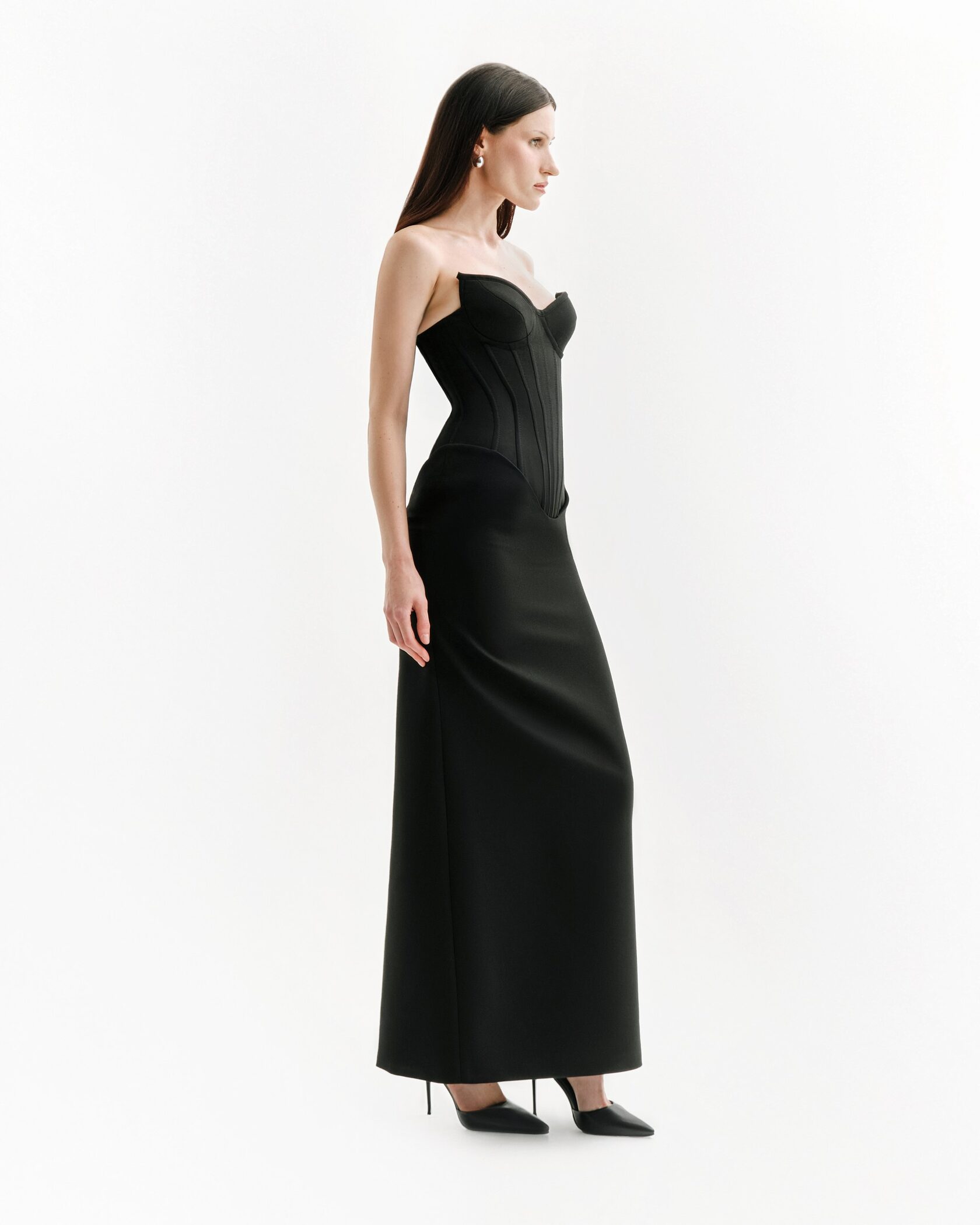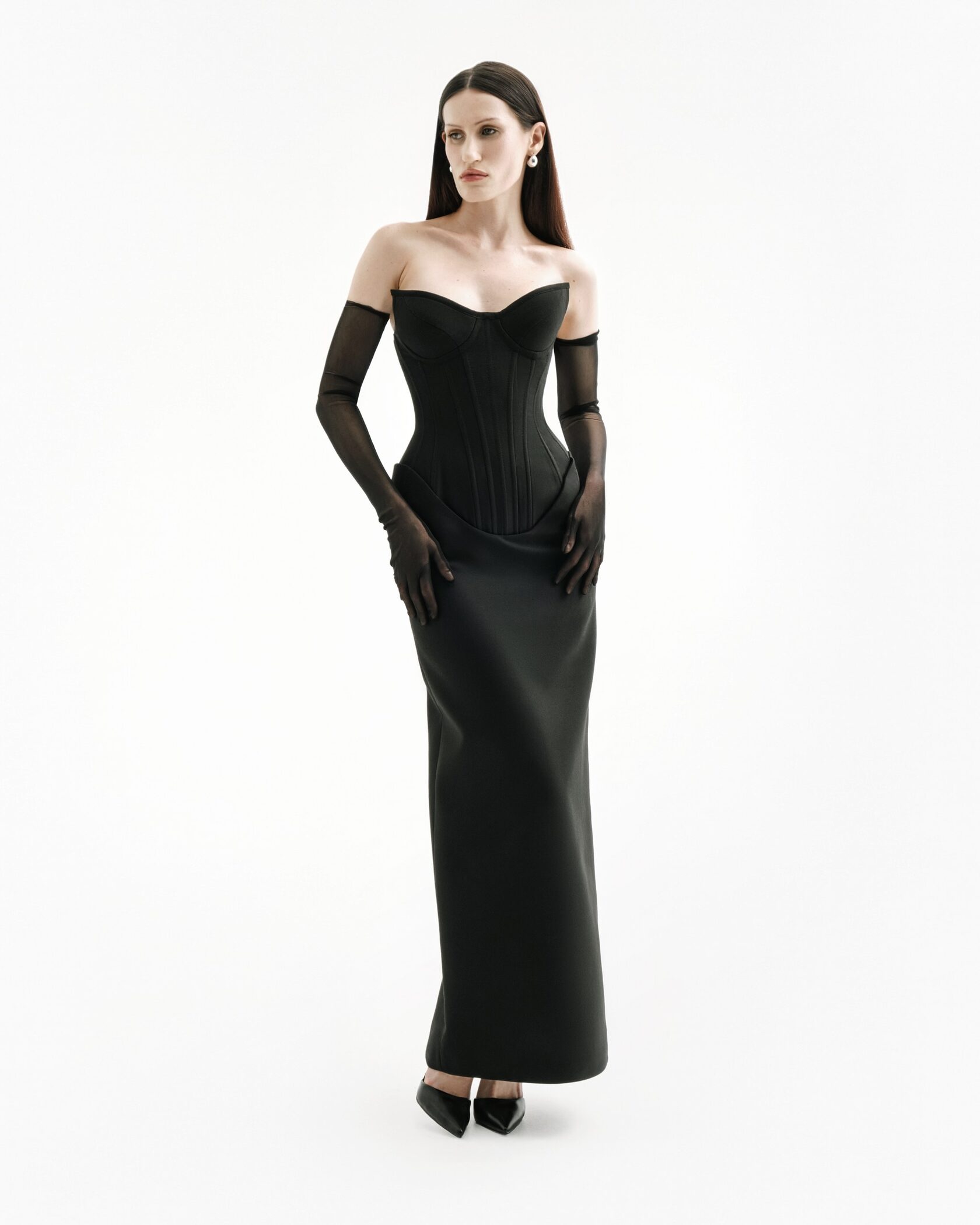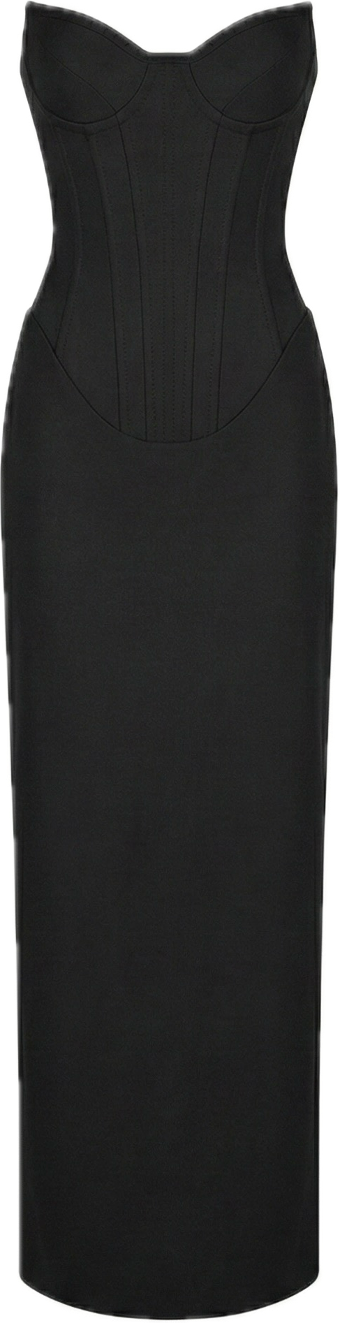 Description: Maxi dress with a fitted silhouette. The bodice features a sculptural corset design with cups that shapes the figure and accentuates the décolletage. • Features: waist seam, decorative corset stitching, back slit for ease of movement. Statement metal zipper closure at the center back. Composition: • Shell: 60% Polyester, 35% Viscose, 5% Cotton • Lining: 100% Cotton Care: dry clean, ironing at low temperature allowed