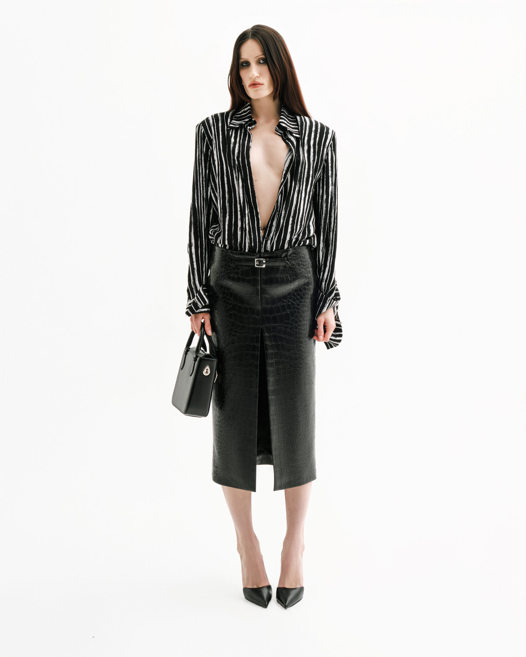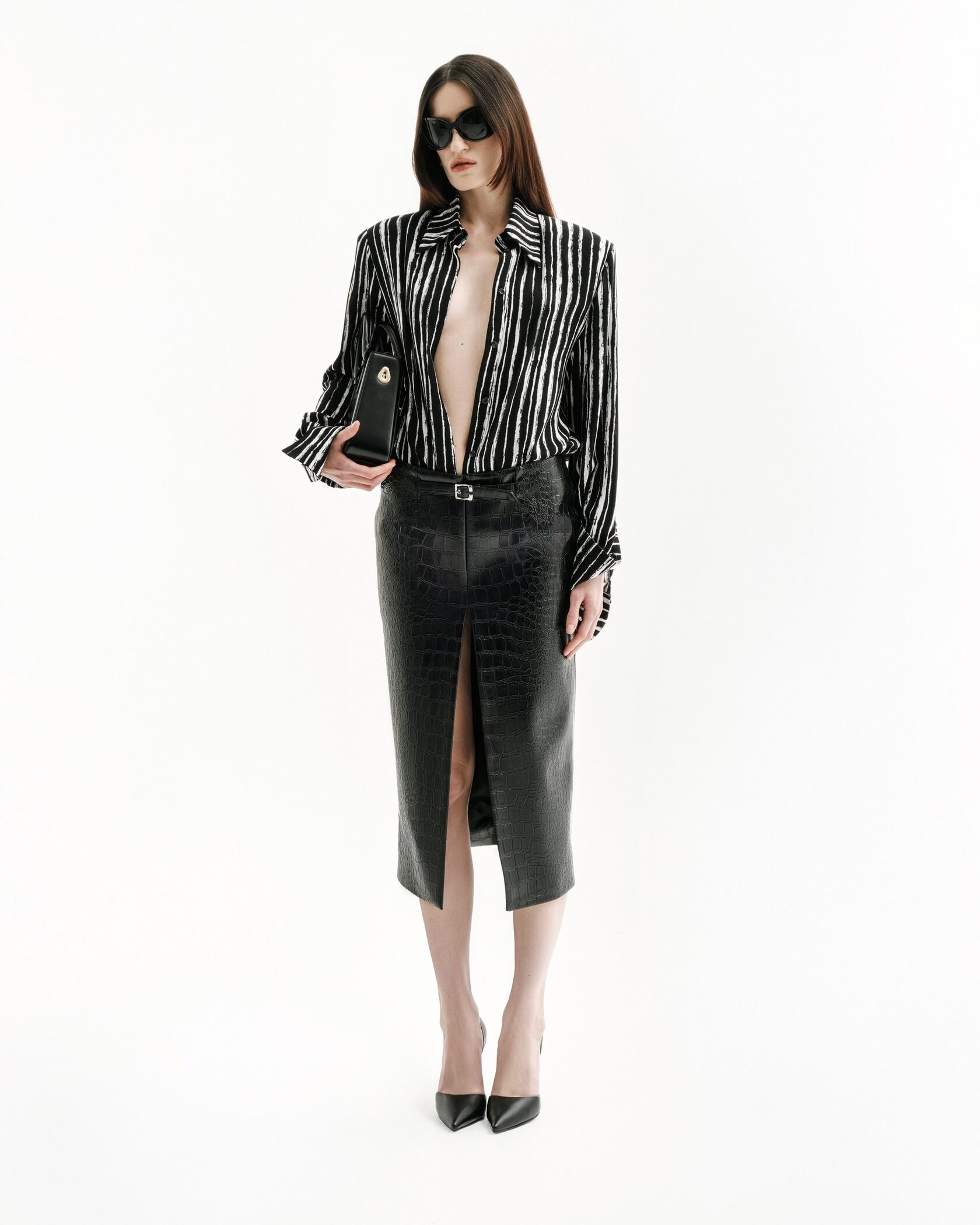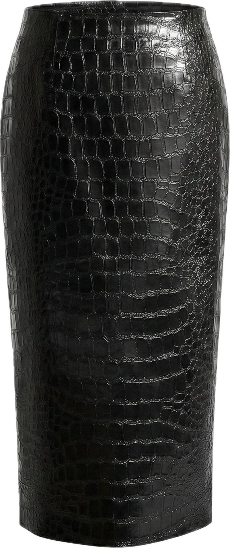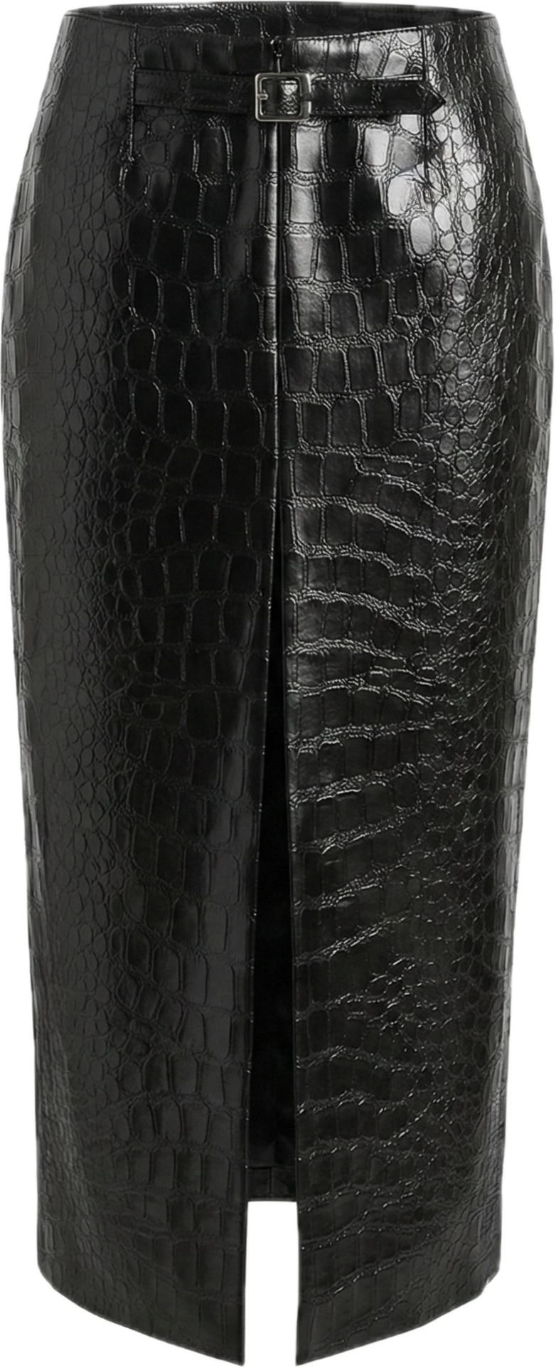 Description A straight-cut midi skirt crafted from dense material with a glossy finish and crocodile skin imitation. • Features: Low-rise fit, statement center-front slit. • Details: Decorative strap with a metal buckle at the waist. Concealed front zipper closure. Composition • Shell: 100% Vegan Leather with croc-effect. • Lining: 70% Polyester, 30% Viscose. Care Dry clean only. Do not iron.