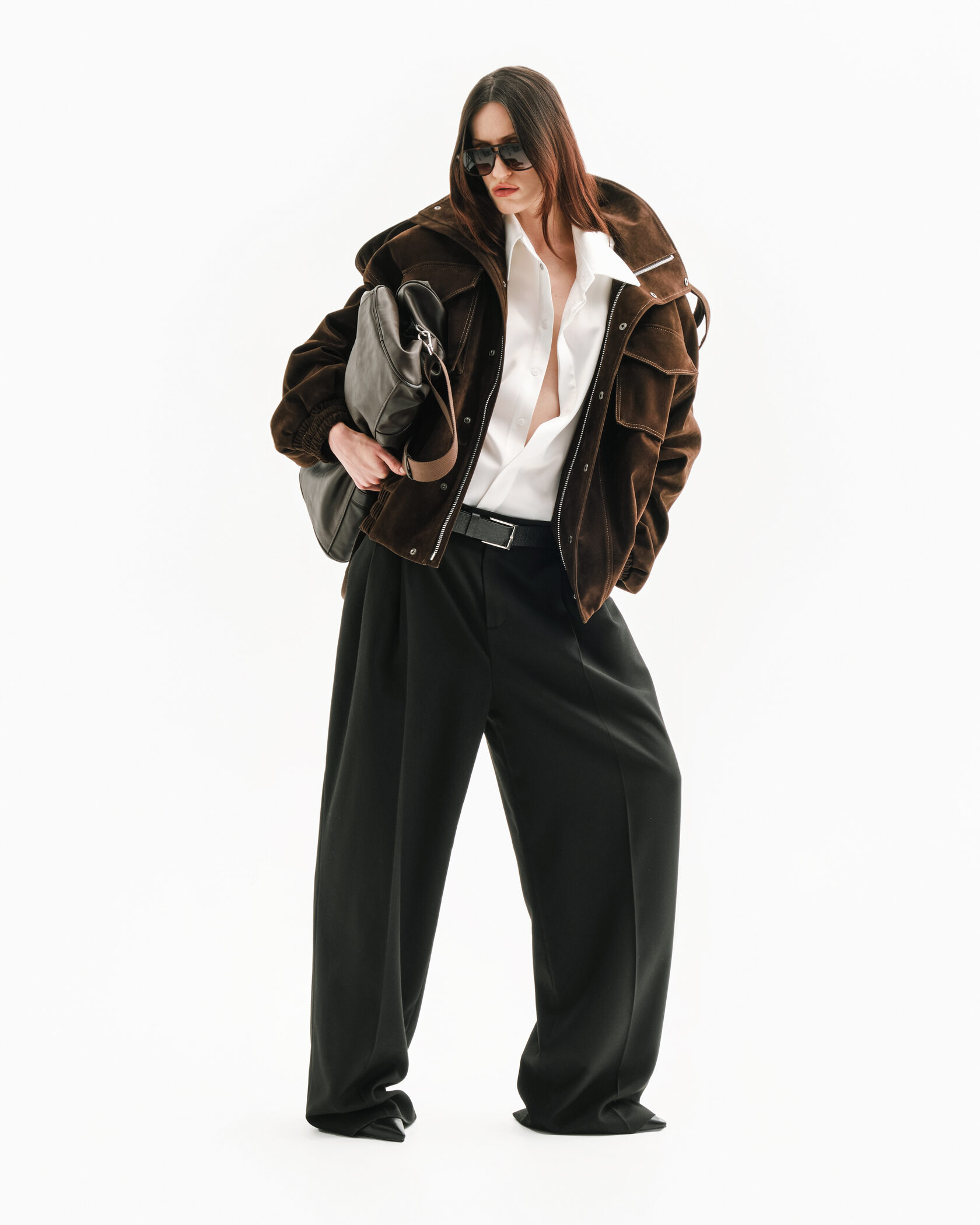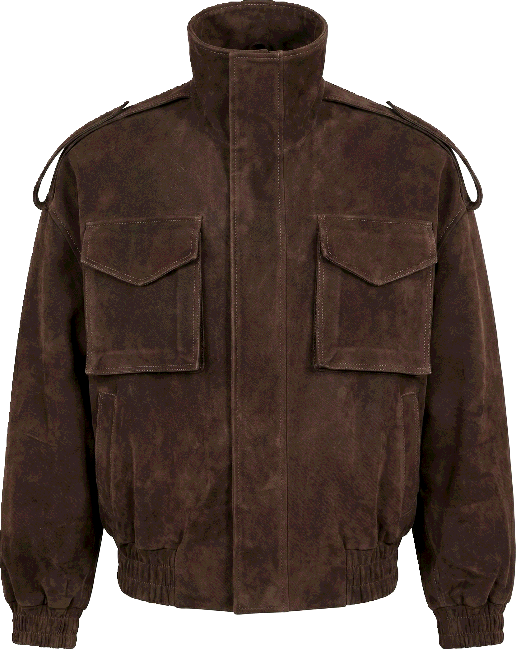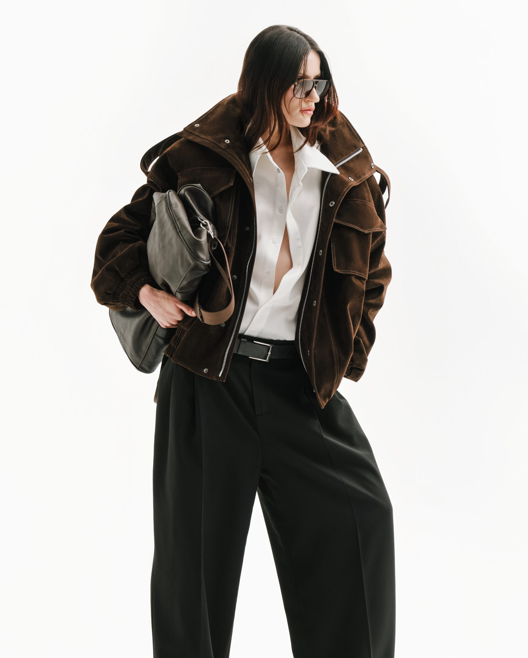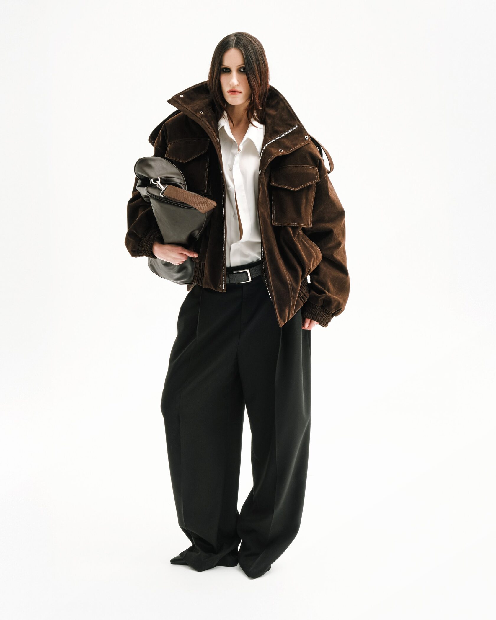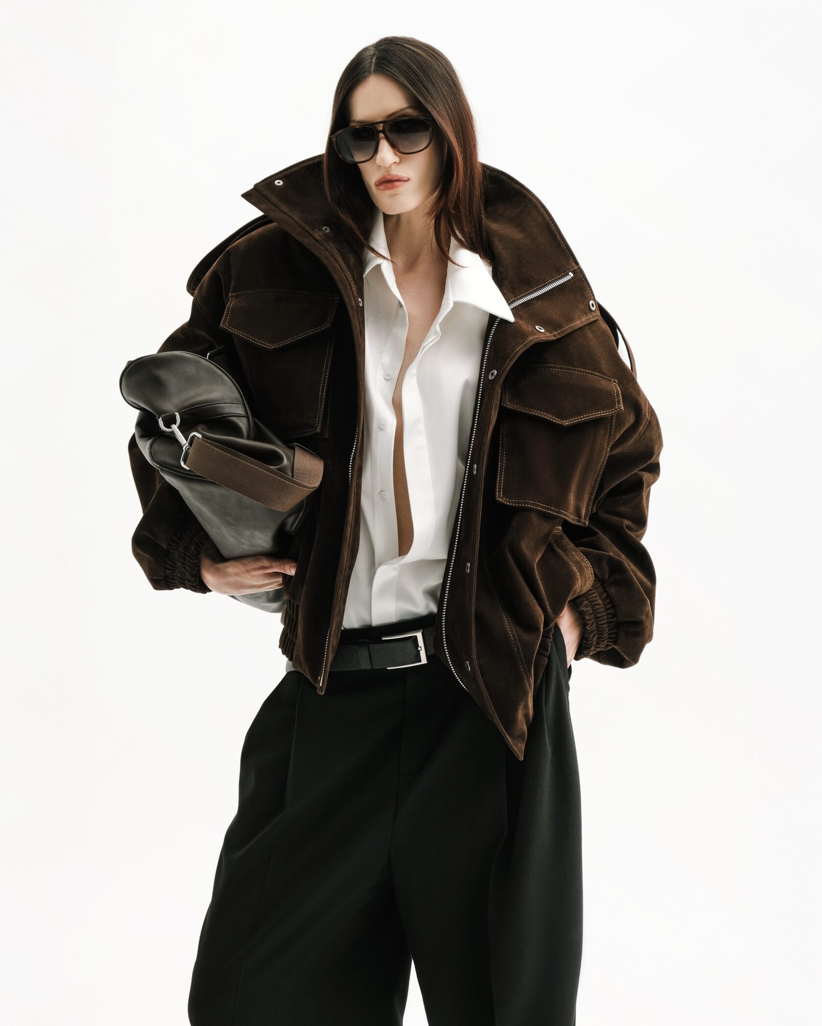 Description: Voluminous loose-fit bomber jacket. Made of dense faux suede with a pleasant velvety texture in deep brown. Military-style model with accent details. • Features: high stand collar, shoulder epaulettes, large patch pockets with flaps on the chest. Elasticated cuffs and wide elastic hem for a comfortable fit. Zipper closure concealed by a wind flap. Loose back yoke. Composition: • Shell: 100% Eco-suede • Lining: 30% Viscose, 70% Polyester Care: dry clean, do not iron