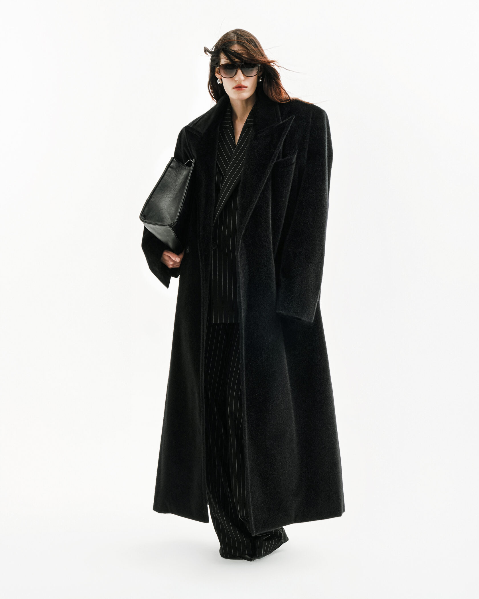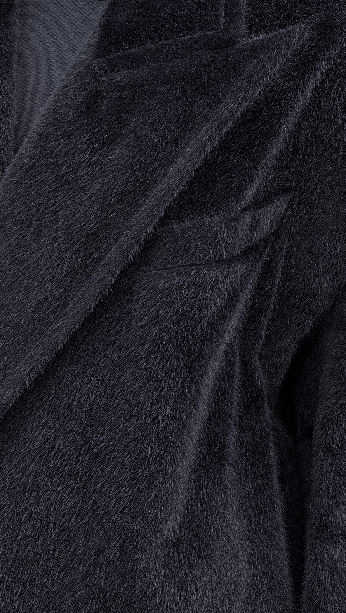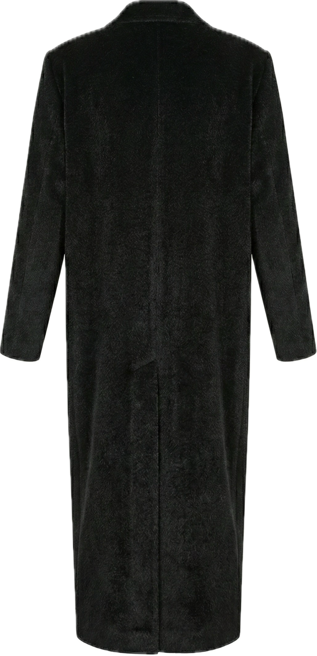 Description: Structured oversized maxi coat with a straight cut and extended shoulder line. Made from textured short-pile faux fur in black with a delicate sheen. • Features: classic collar with wide peak lapels, side flap pockets, welt chest pocket, center back vent for ease of movement. Composition: • Shell: 100% Faux Fur • Lining: 30% Viscose, 70% Polyester Care: dry clean, do not iron