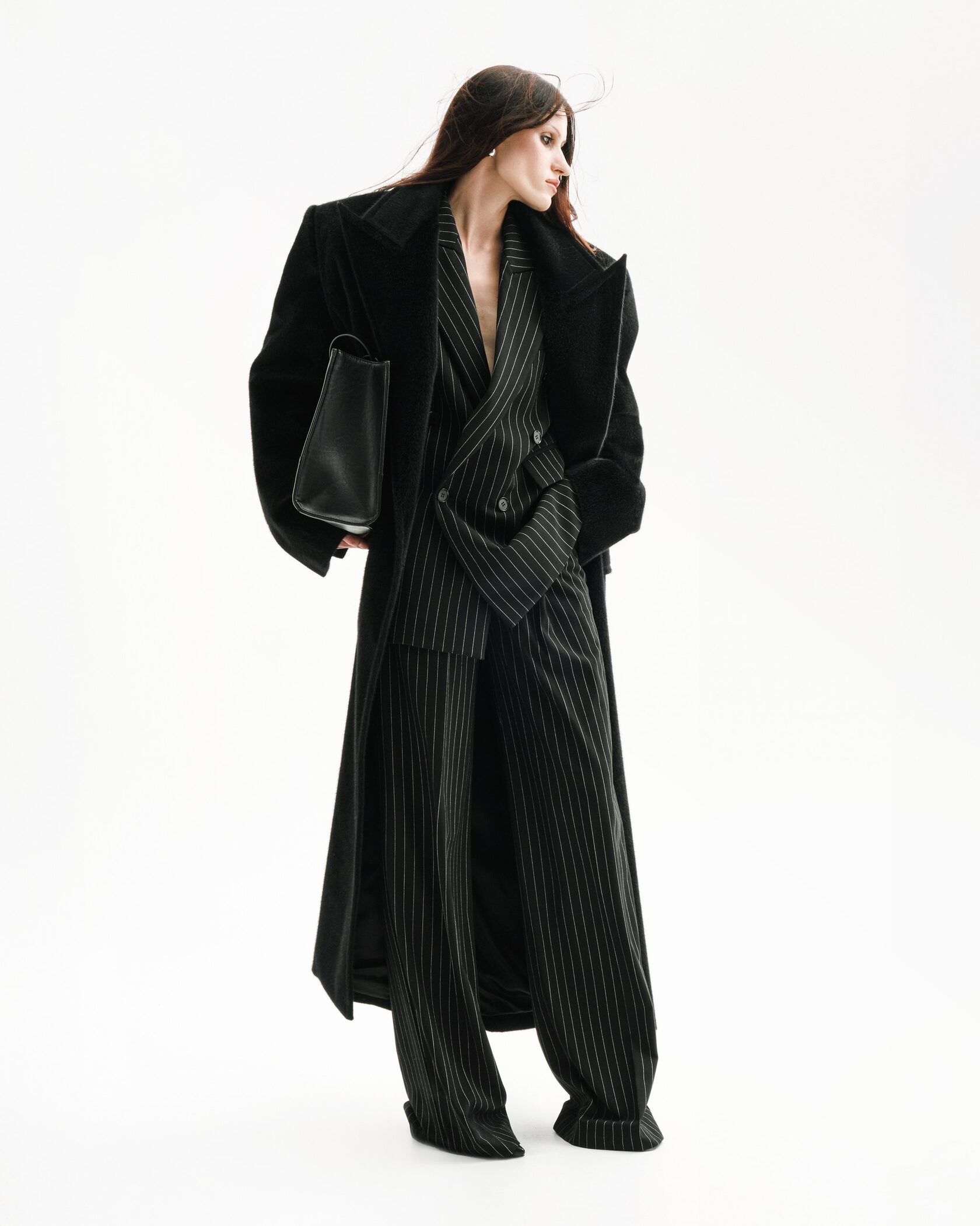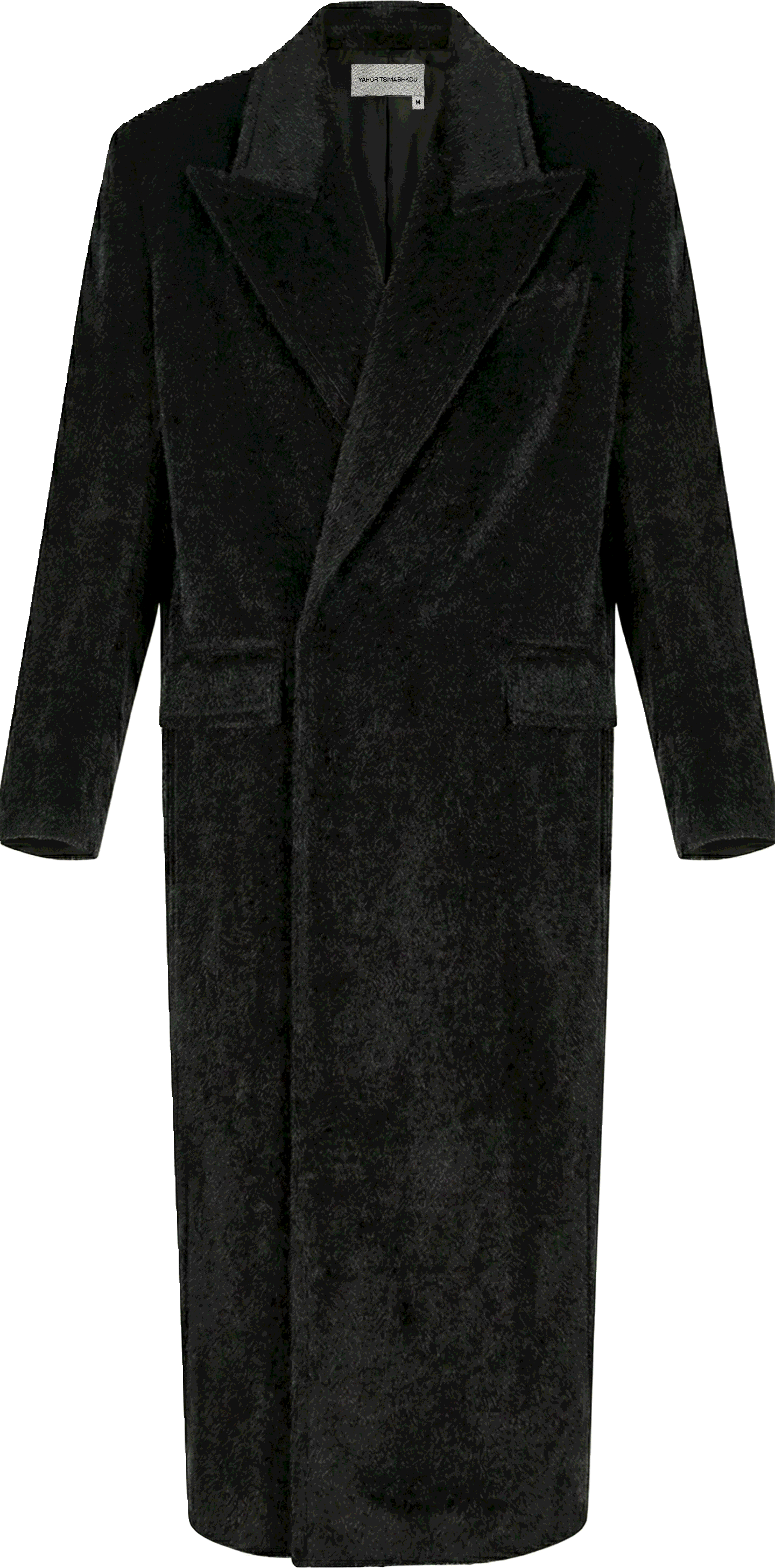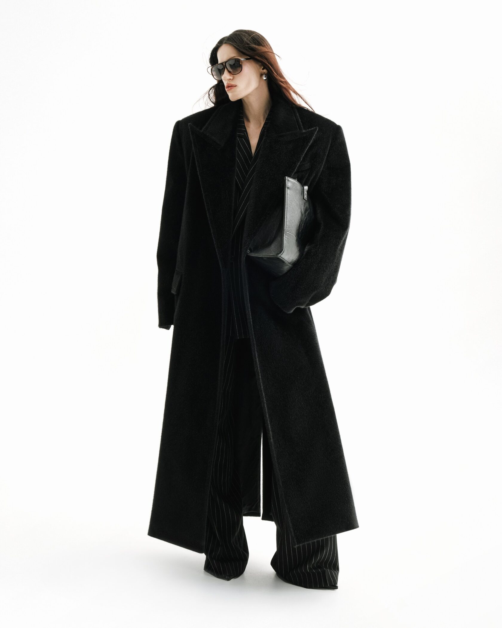Description: Structured oversized maxi coat with a straight cut and extended shoulder line. Made from textured short-pile faux fur in black with a delicate sheen. • Features: classic collar with wide peak lapels, side flap pockets, welt chest pocket, center back vent for ease of movement. Composition: • Shell: 100% Faux Fur • Lining: 30% Viscose, 70% Polyester Care: dry clean, do not iron