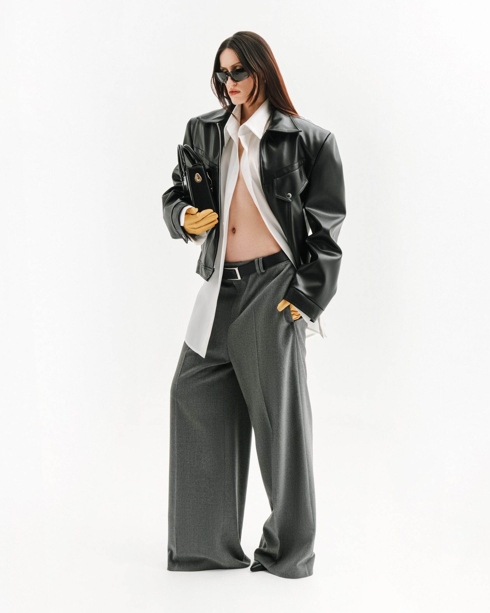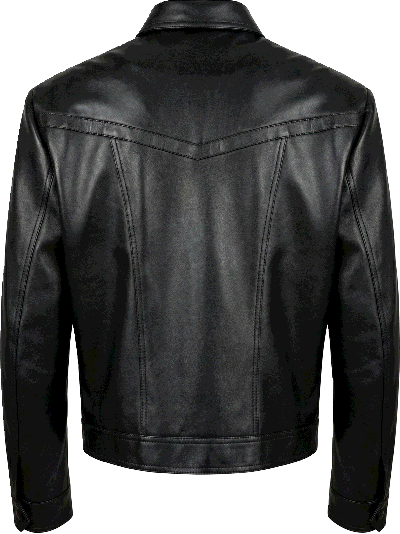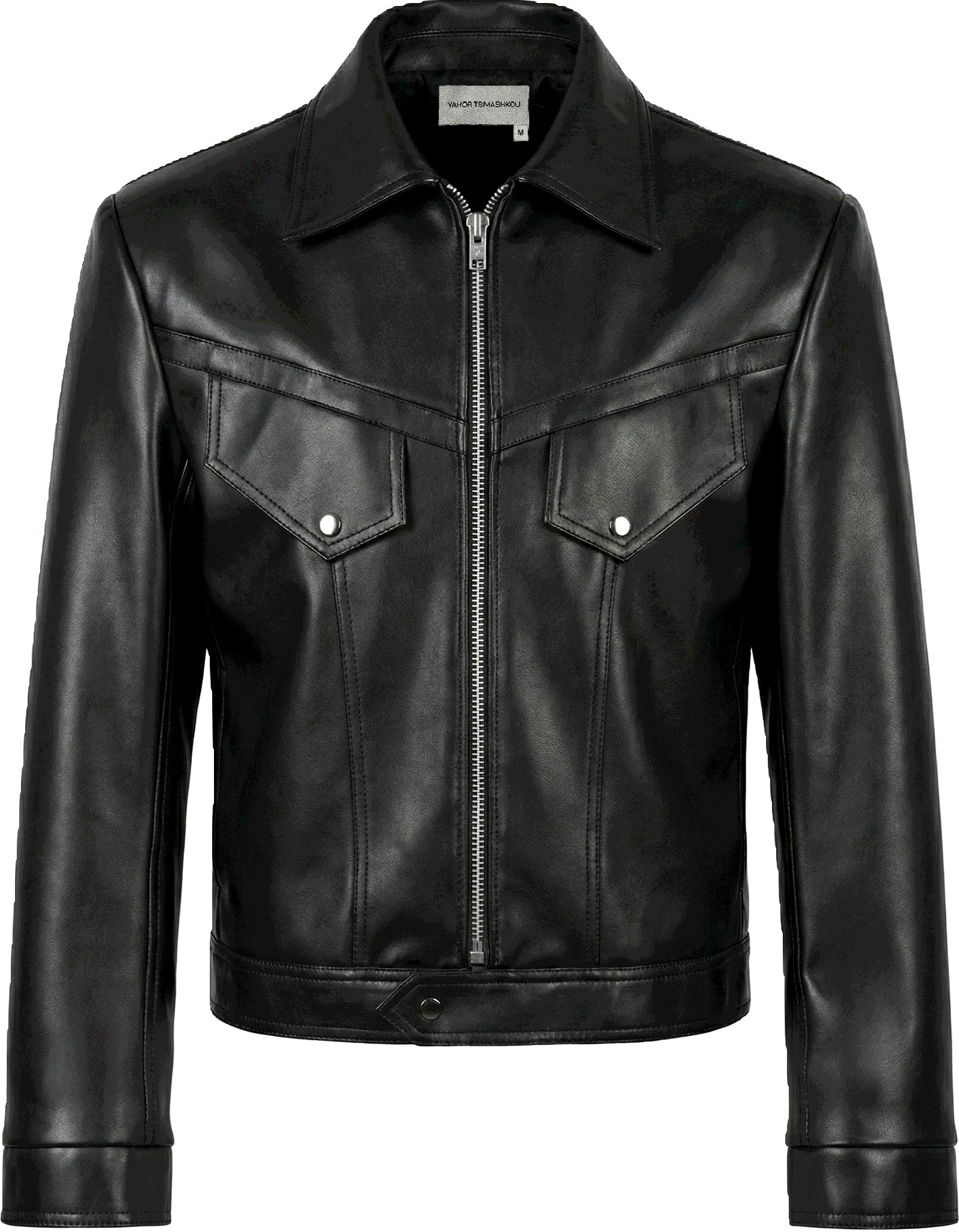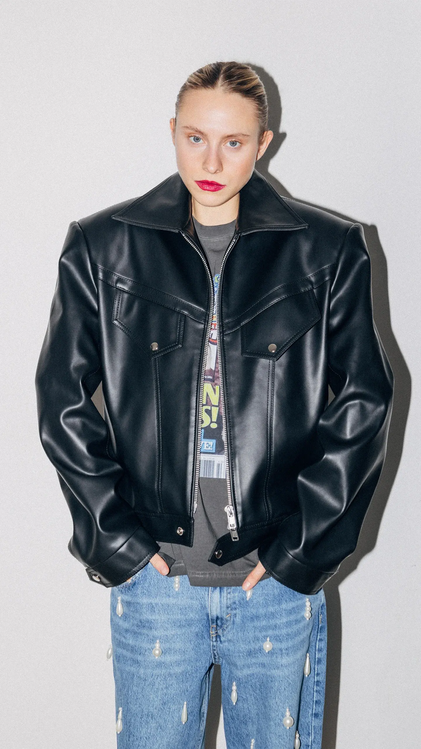 Description: A straight-cut Western-style jacket. Crafted from dense, smooth eco-leather with a matte finish. • Features: turn-down collar, shaped front and back yokes, two chest pockets with snap-button flaps. Sleeve cuffs and hem feature snap-button tabs. Fastens with a central silver-tone metal zipper. Composition: • Shell: 100% Eco-leather • Lining: 70% polyester 30 %Viscose. Care: dry clean only, do not wash, do not iron.