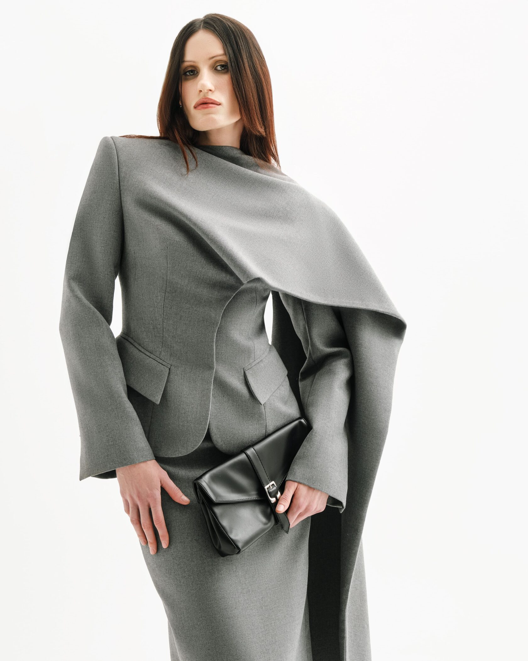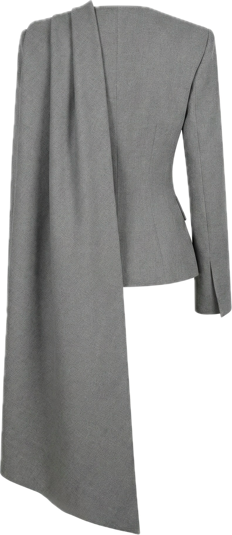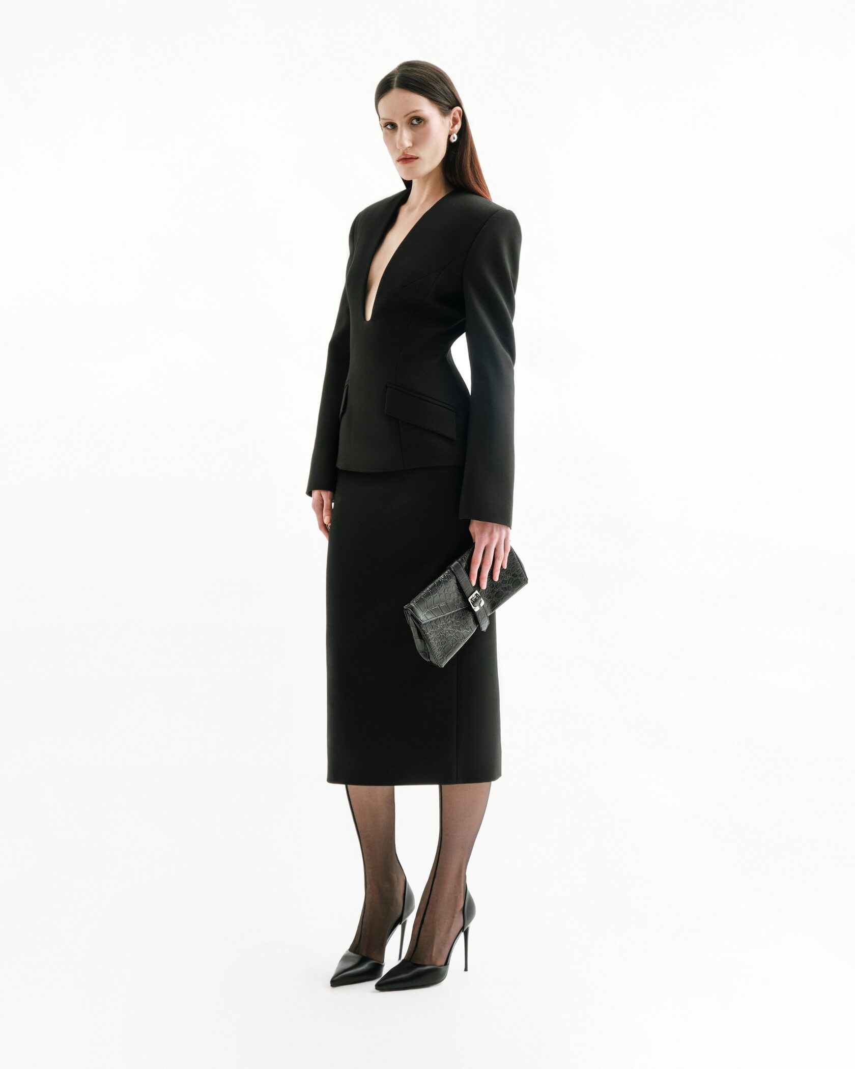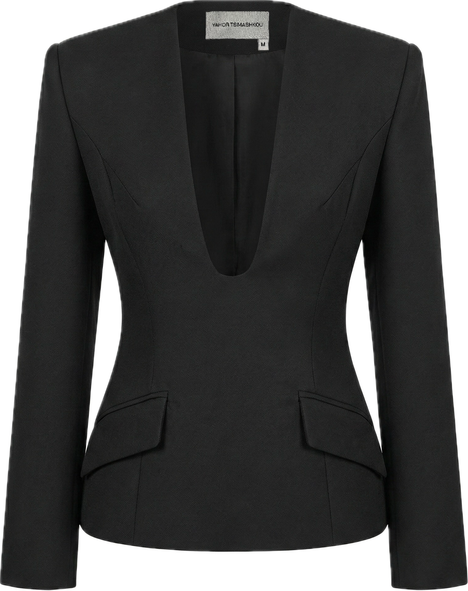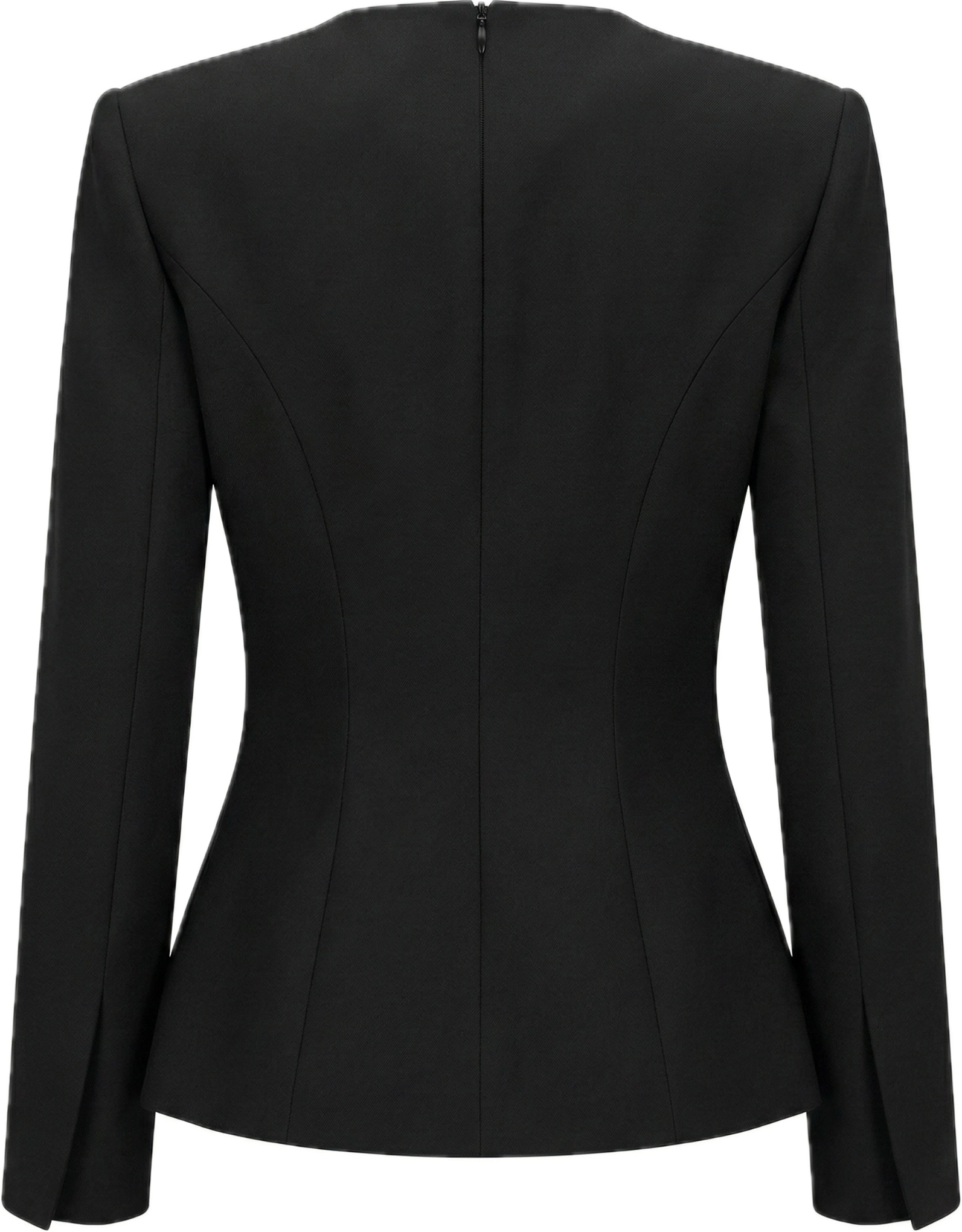 Description: A sculptural fitted jacket. Crafted from dense, structured suiting fabric • Features: Deep plunging neckline, structured accent shoulders, side flap pockets, sleeve vents. Clean front design (no front fastening). Fastens with a concealed zipper at the center back seam. • Important note: This model is designed for a close fit. Composition: Shell: 65% Polyester, 30% Viscose, 5% Cotton Lining: 70% Polyester, 30% Viscose