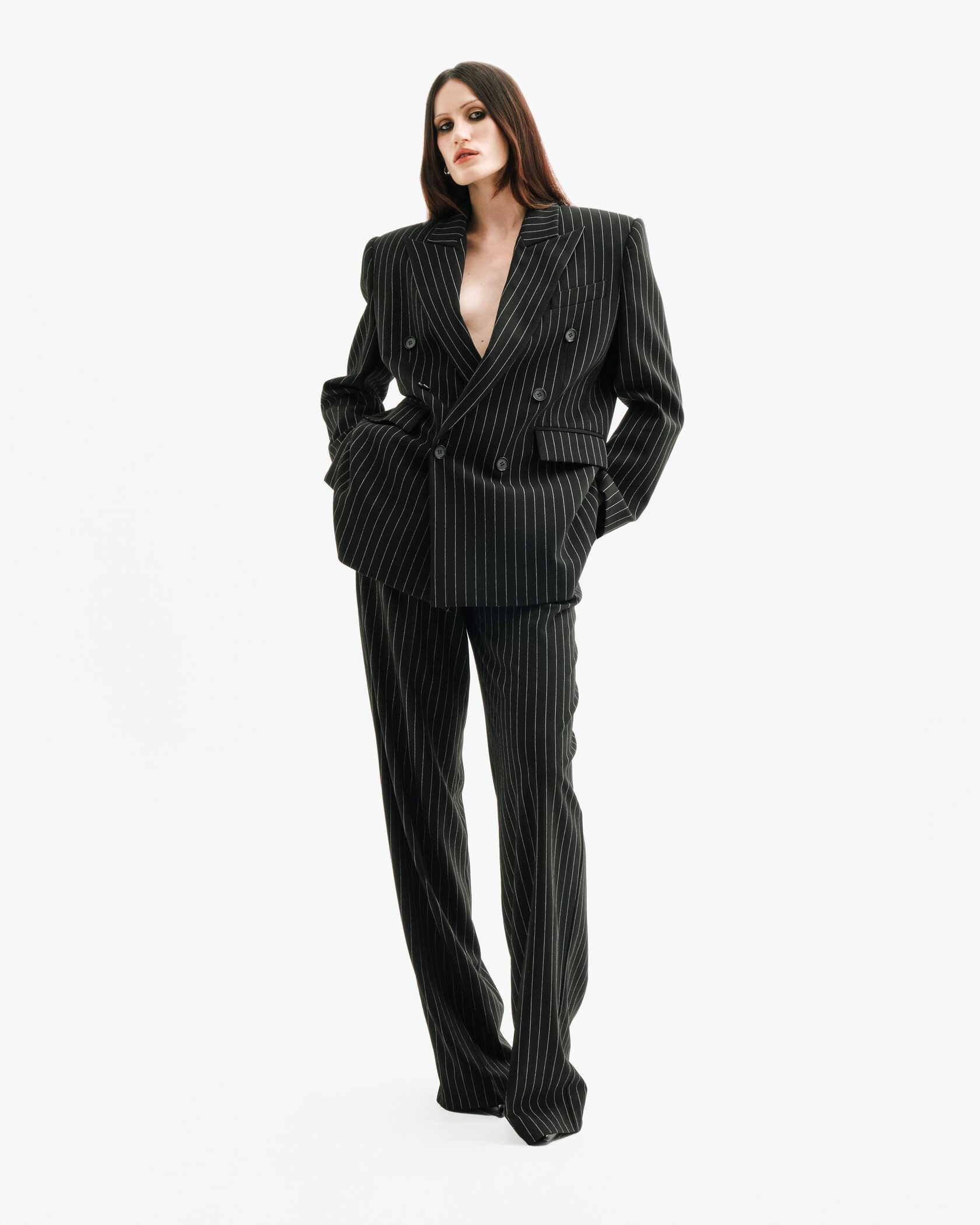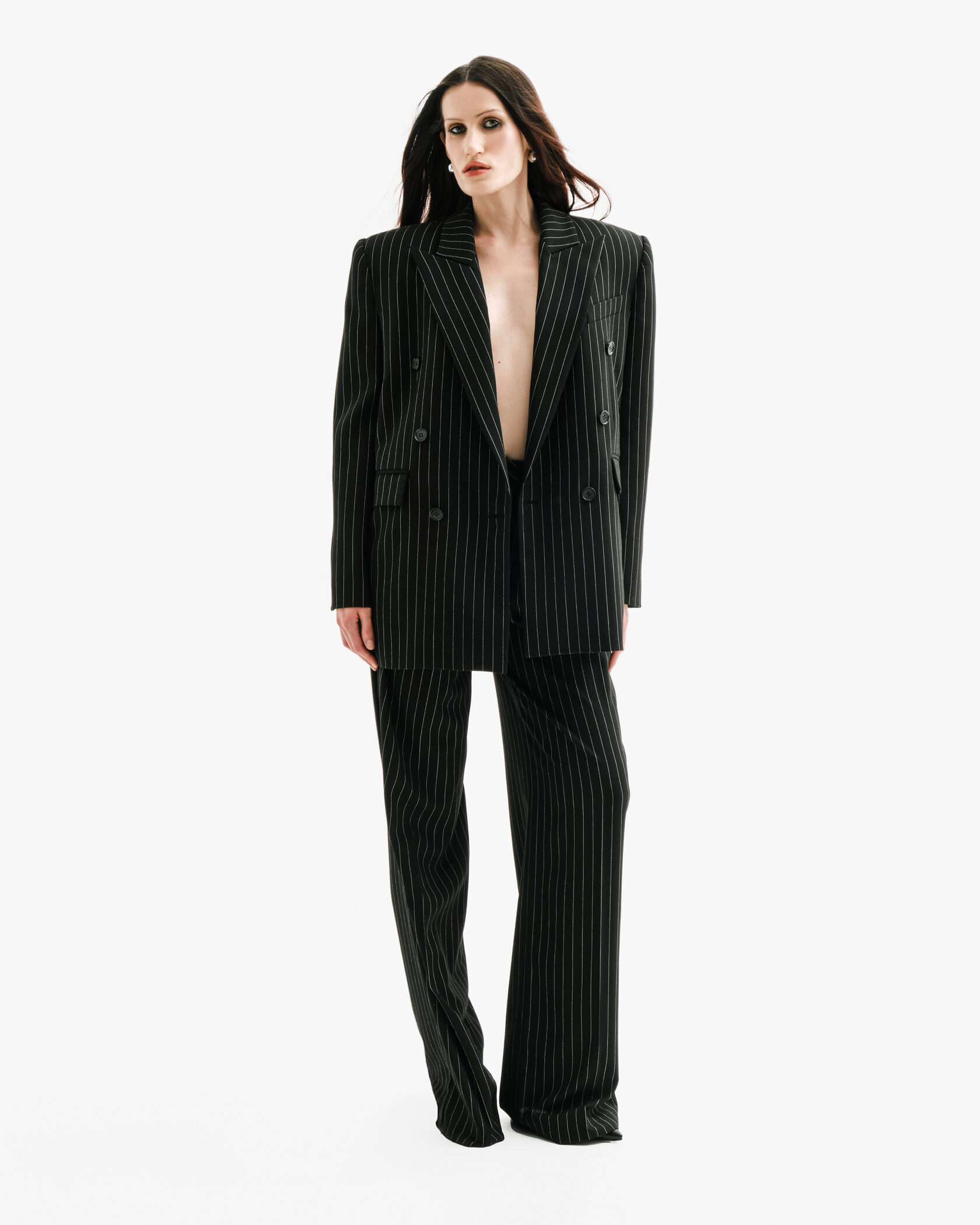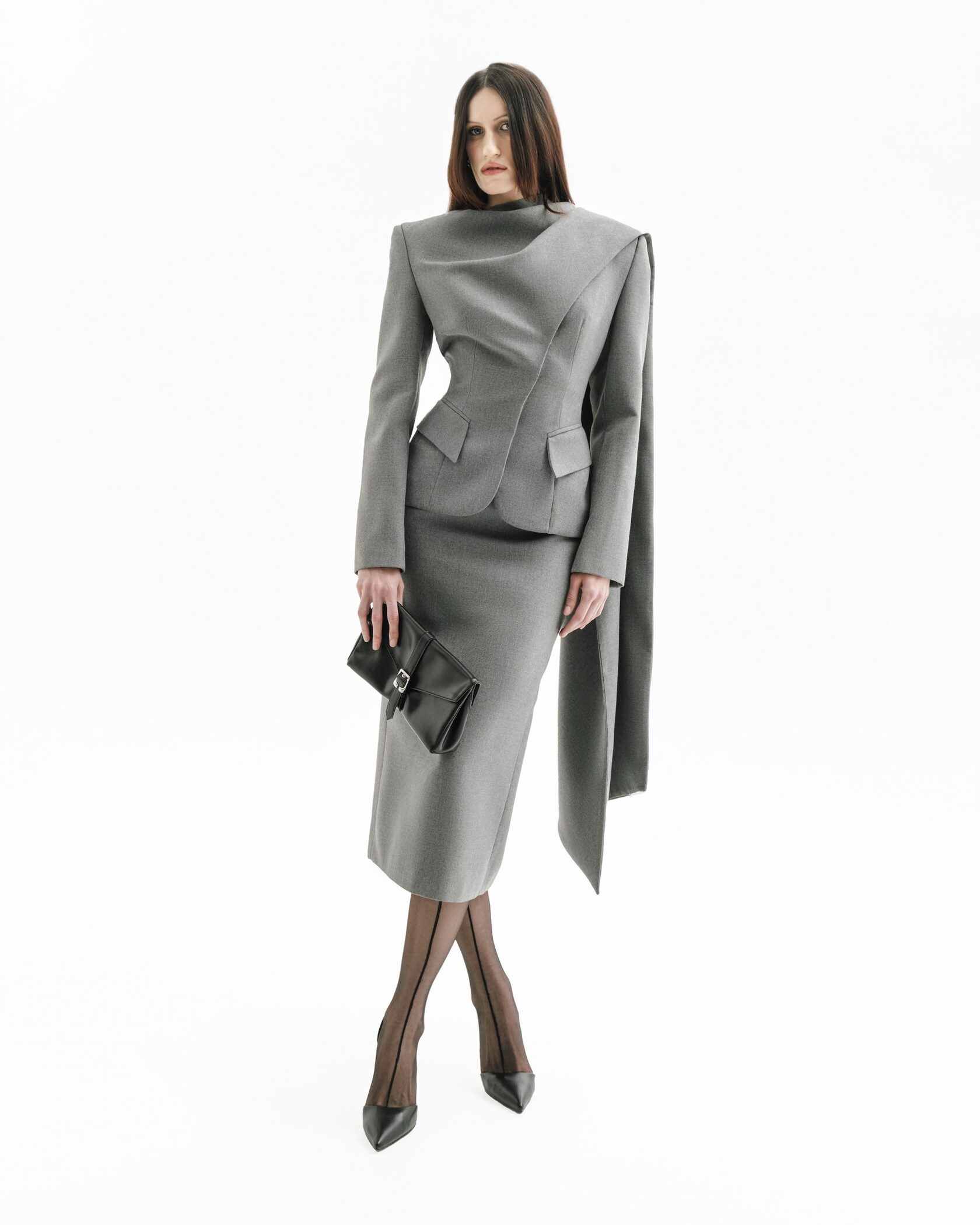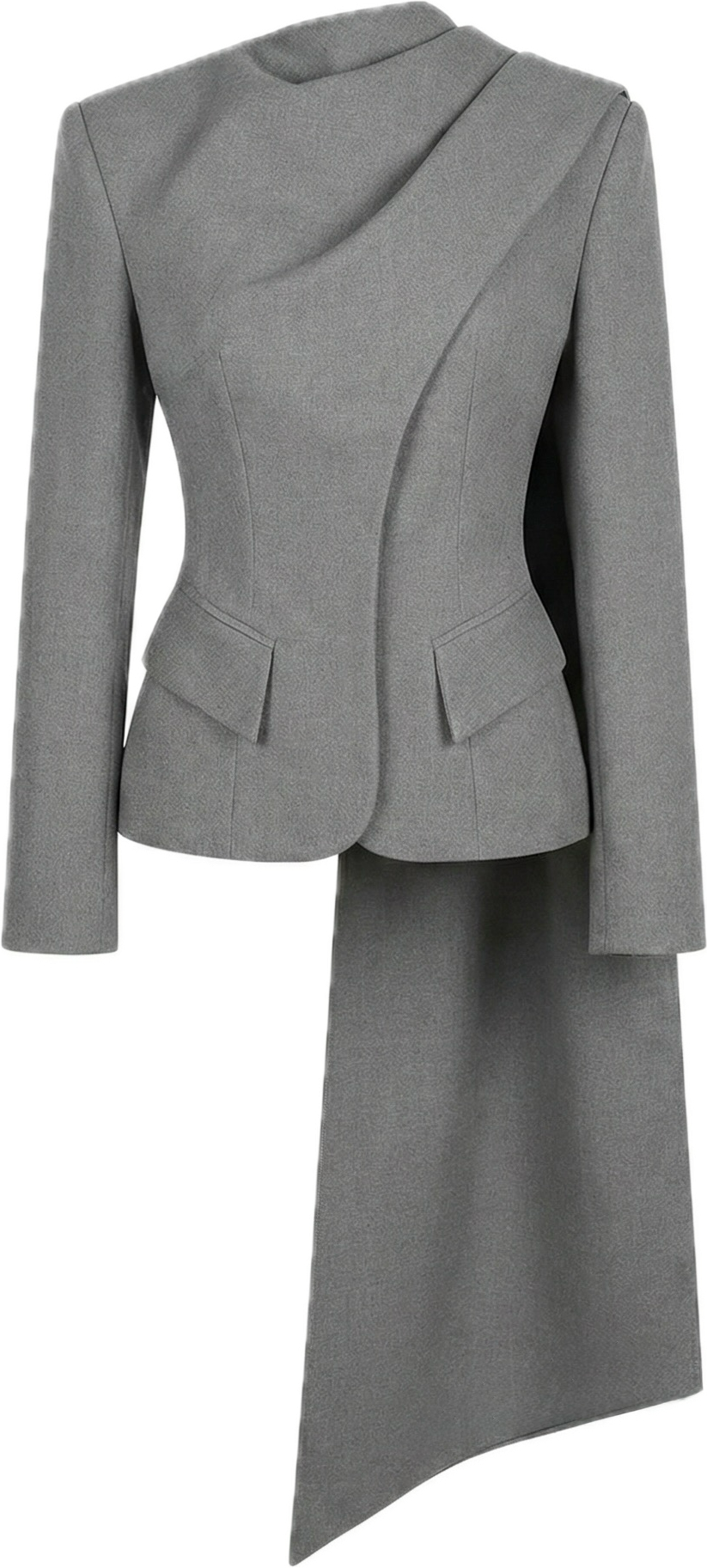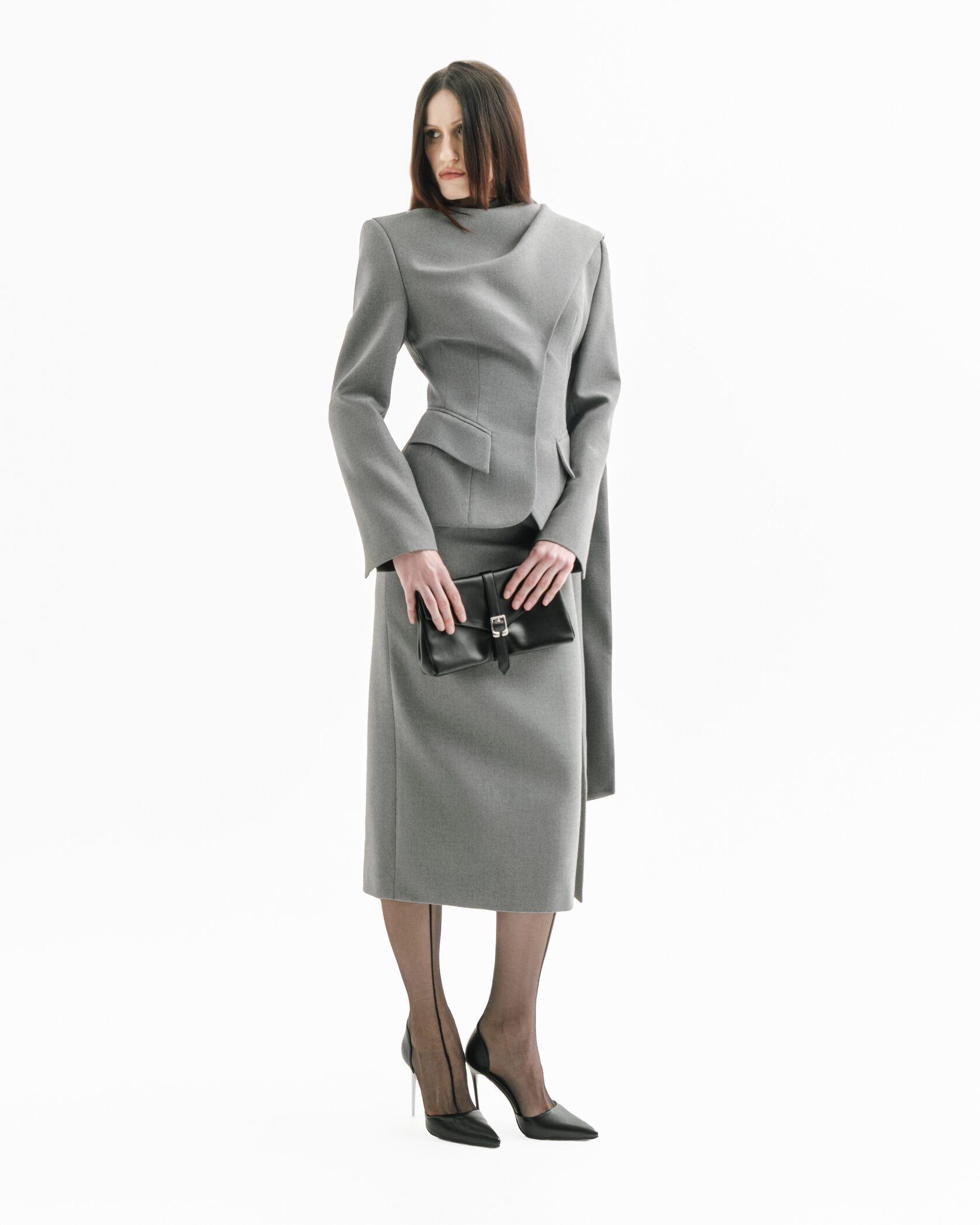 Description: A sculptural fitted jacket. Crafted from dense, structured suiting fabric • Features: Deep plunging neckline, structured accent shoulders, side flap pockets, sleeve vents. Clean front design (no front fastening). Fastens with a concealed zipper at the center back seam. • Important note: This model is designed for a close fit. Composition: Shell: 65% Polyester, 30% Viscose, 5% Cotton Lining: 70% Polyester, 30% Viscose