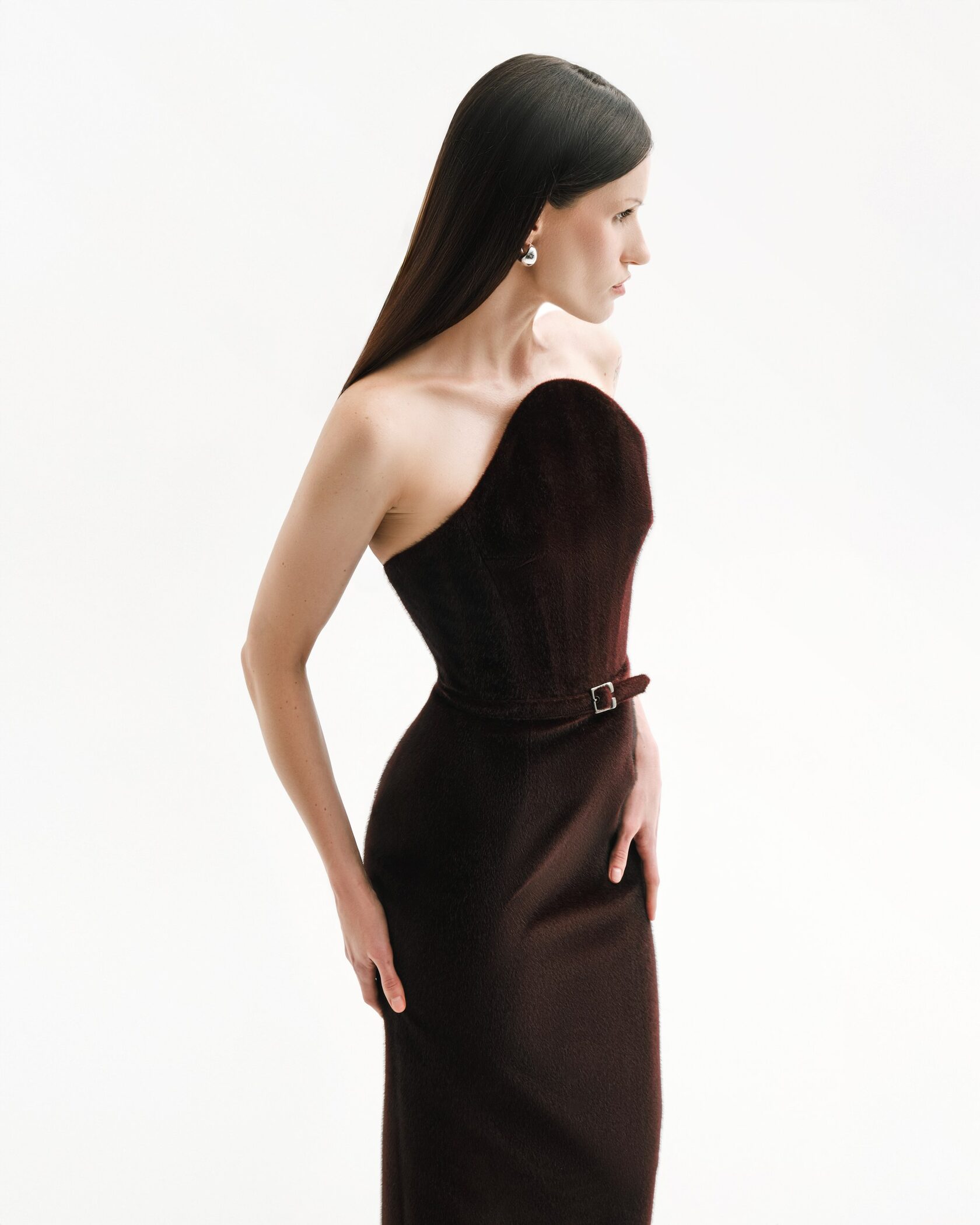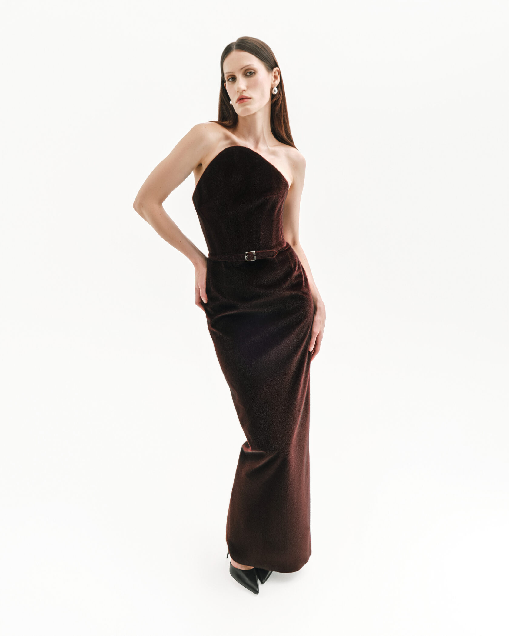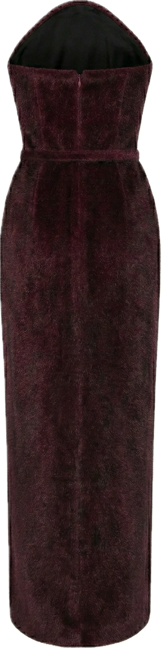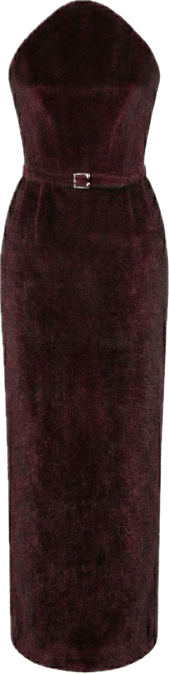 Bordeaux maxi dress crafted from textured short-pile faux fur. A fitted, strapless silhouette. The bodice is reinforced with boning to ensure a perfect fit and structural stability. • Features: soft textured material, detachable belt with a buckle to accentuate the waist, deep back slit for ease of movement. Concealed zipper closure at the center back seam. Composition: • Shell: 100% Faux Fur • Lining: 70% Polyester, 30% viscose Care: dry clean, do not iron, steaming allowed