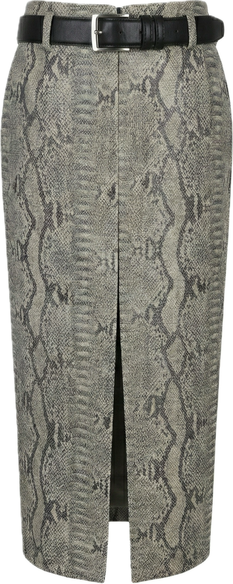 Description A straight-cut midi skirt crafted from structured fabric featuring a realistic python skin print. Features • Low-rise waist with belt loops. • Deep center-front slit. • Concealed zipper closure. Important Note: The belt shown in the photo is for styling purposes only and is not included. Composition • Shell: Polyester 60% cotton 40 % • Lining: 70% Polyester, 30% Viscose Care Dry clean only, do not iron.