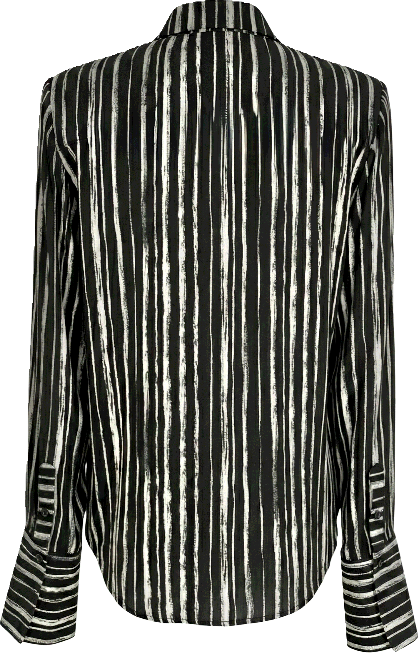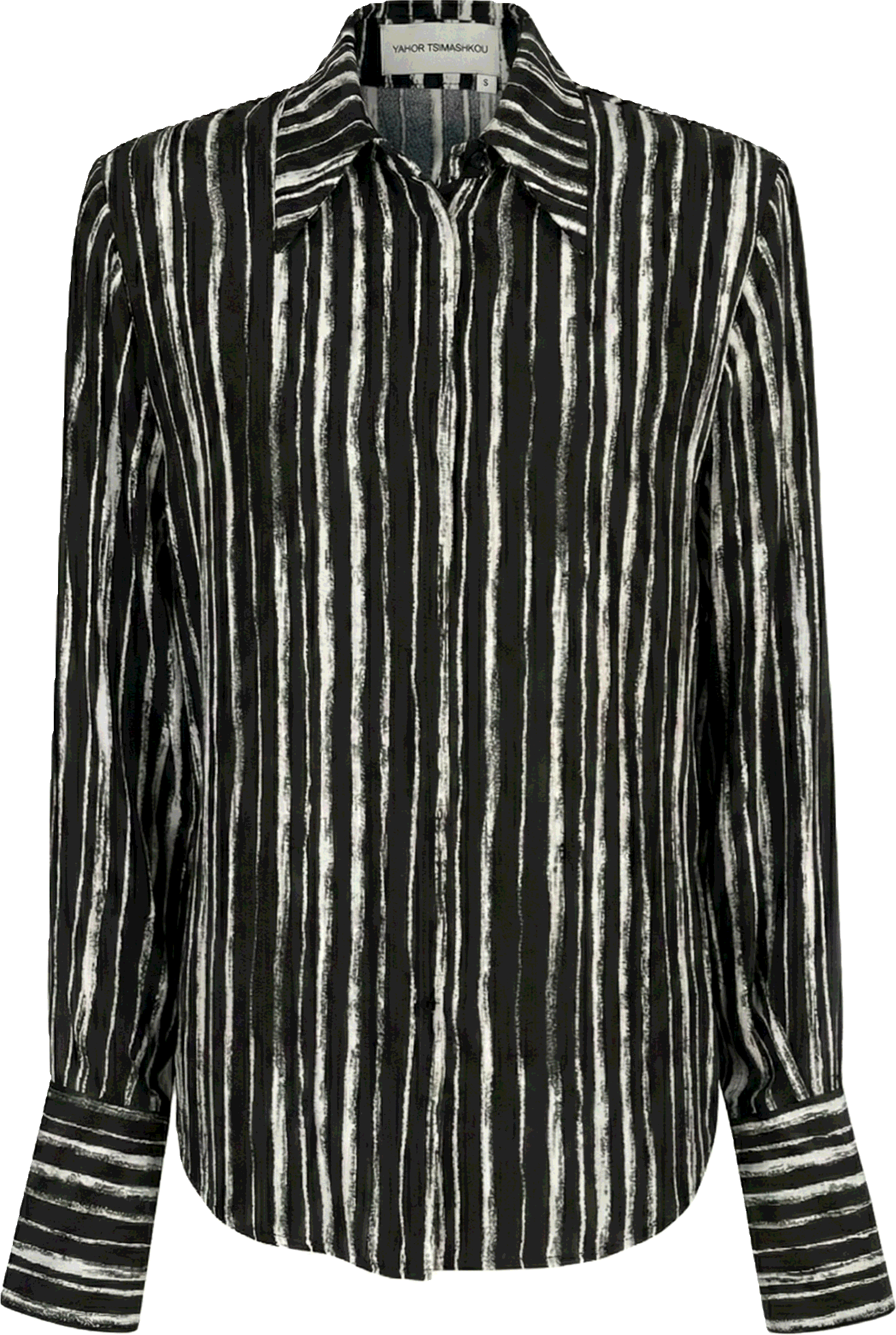 Description: Straight-cut shirt with a classic collar. Made from soft natural fabric with a contrasting graphic vertical stripe print. • Features: built-in shoulder pads for a structured silhouette, wide cuffs with a horizontal pattern, rounded hem. Button placket closure. Composition: • Shell: 100% Cotton. Care: gentle wash at 30°C, iron at medium temperature.